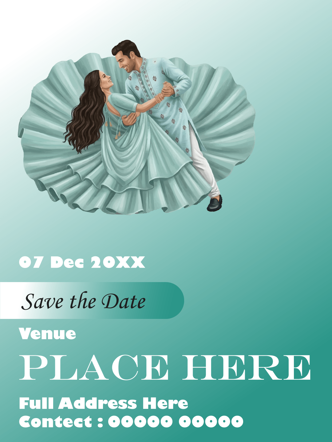 The design is suitable for multiple wedding celebrations including engagement invitations, pre-wedding event announcements, mehndi and haldi ceremony invites, sangeet function invitations, wedding day announcements, and reception party invitations. The high-resolution layout ensures professional quality across smartphones, social media sharing platforms, email invites, and print formats.