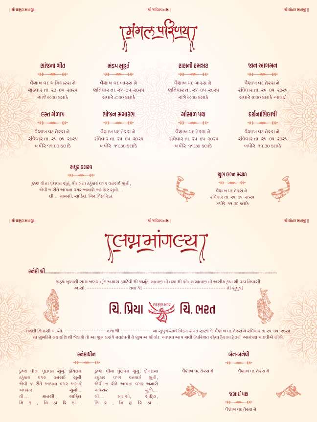 This template respects the traditional structure of a Gujarati wedding card, making it suitable for elders, relatives, and guests who value heritage and clarity. At the same time, its clean and balanced design appeals to modern couples looking for a refined yet culturally grounded invitation.
