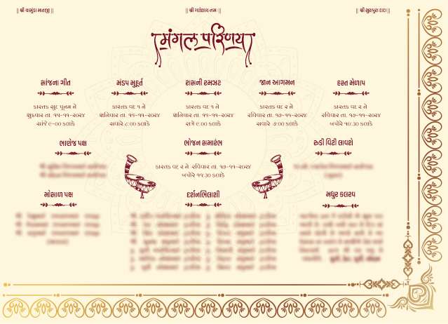 One of the most valuable features of Wedding Invitation Kankotri JG-4 is its editability. You can easily customize names, dates, venues, muhurat details, and ceremony information to match your wedding schedule. This flexibility saves time and eliminates the need for complex design work or repeated revisions.